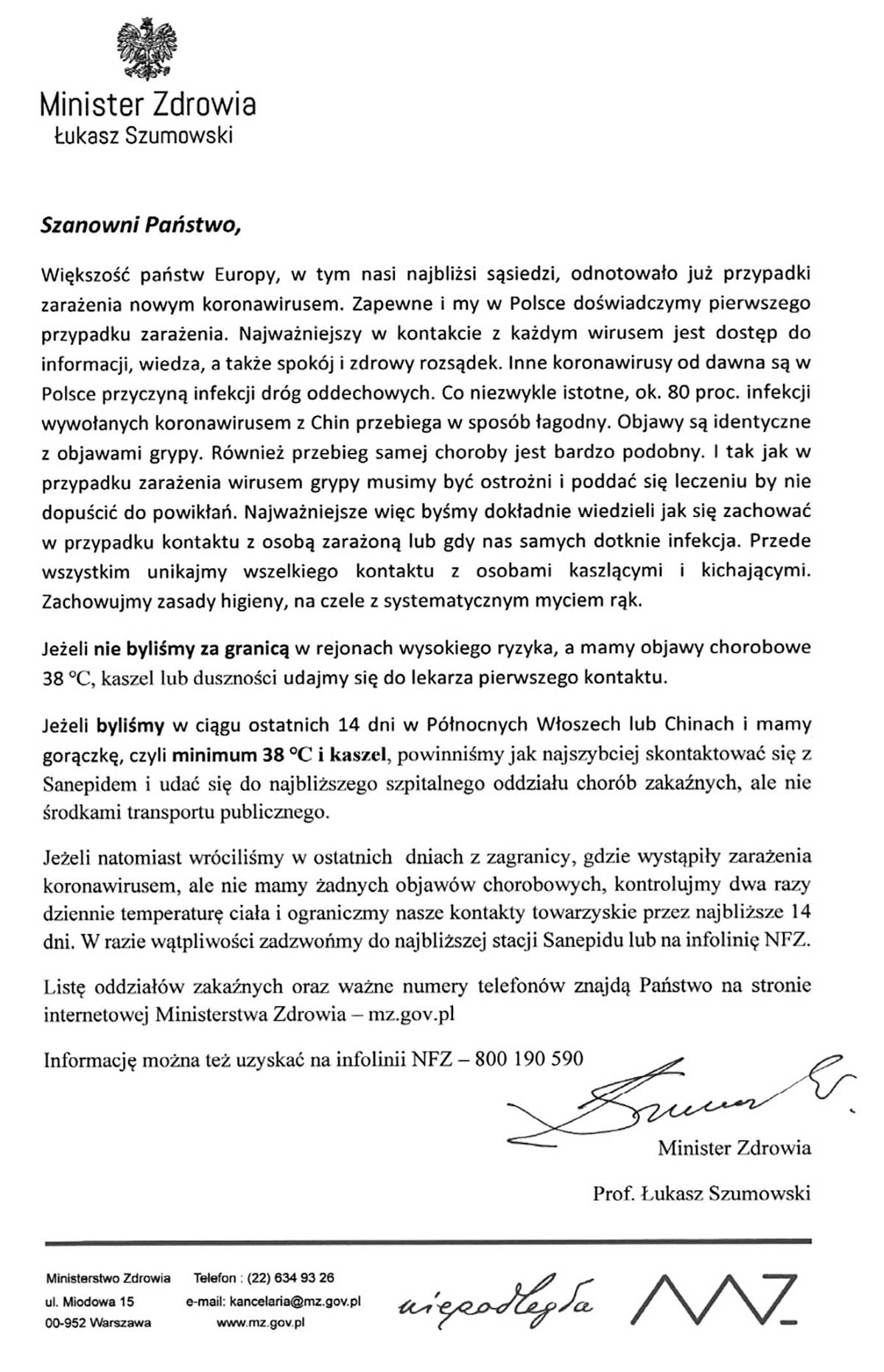 W związku z tym proszę o ograniczenie wszelkich kontaktów, wyjść oraz spotkań. Społeczna kwarantanna jest jednym z najskuteczniejszych środków zapobiegających rozprzestrzenianiu się wirusa.